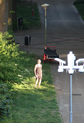 Werd hij gefilmd, vanuit een locatie die we niet konden zien? Of was zijn act 100% solo? Geen idee. Wel wist ik dat de camera's in de voorgrond, van een bouwproject, zich niet interesseren voor Laatste-Zonnestraal-Rituelen.